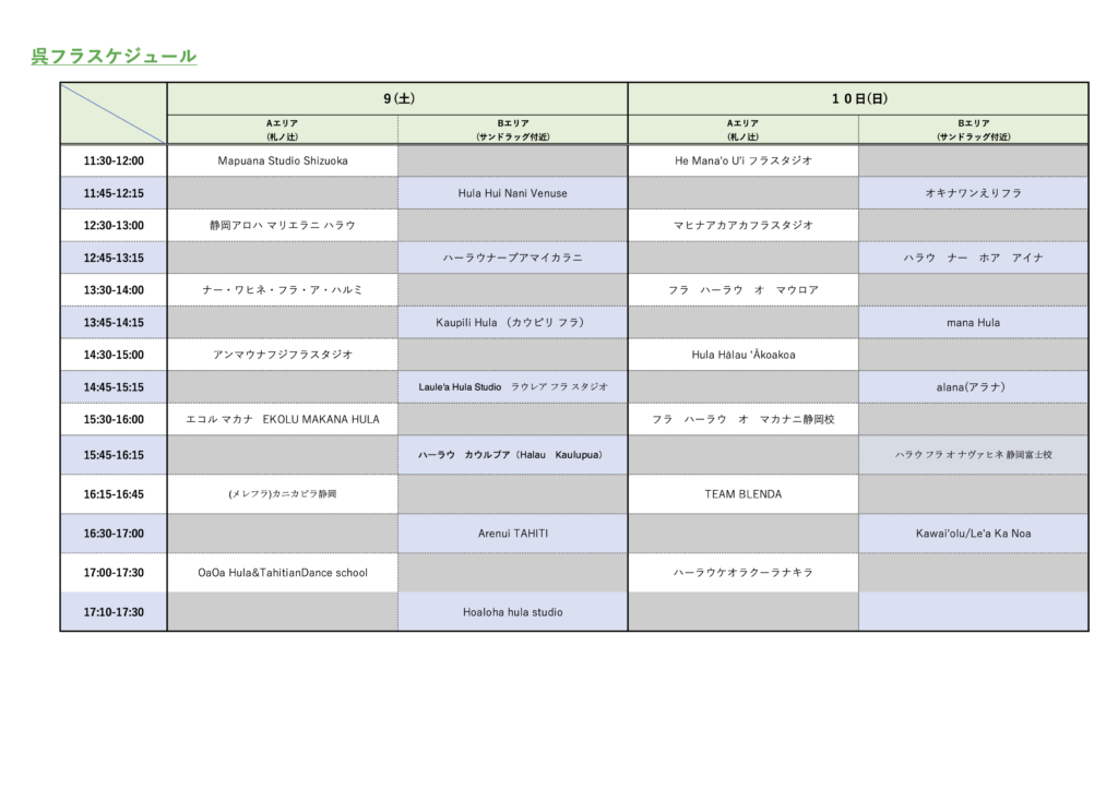 | フラダンスステージ | 静岡市内外からフラダンスを愛する多くの団体が集結し、日頃の活動成果を披露いたします。 美しい衣装に身を包み、その優雅な踊りと心に響くパフォーマンスで、観る人すべてをハワイの楽園へと誘います。 |