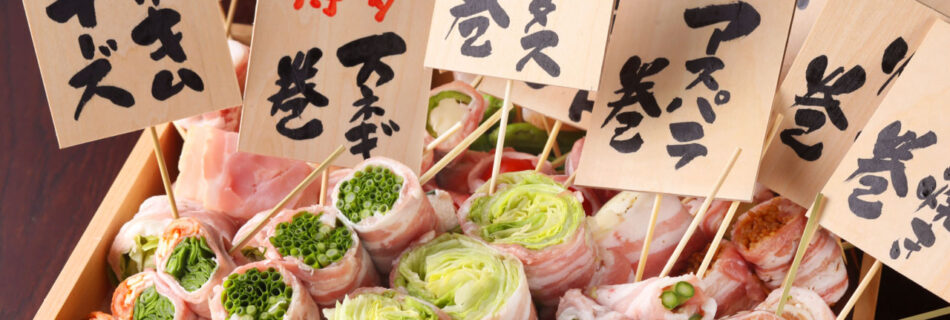 はかた野菜巻き串・こだわり酎ハイ きばくもん 静岡呉服町店 うまいもんだらけの九州博多名物を堪能! 豚肉で野菜を巻いた名物「博多野菜巻き串」はヘルシーでボリューム満点。ゴロゴロ果実が入った「フルーツ酎ハイ」は映 …