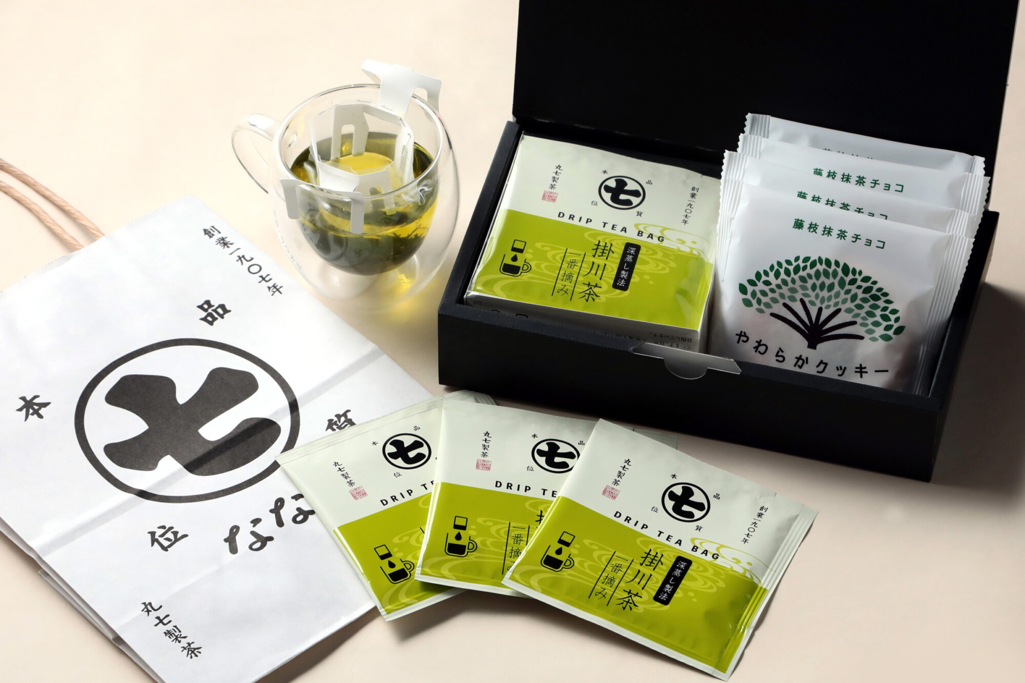 急須で淹れたような風味のドリップティーと、高級な抹茶をホワイトチョコにたっぷり練り込んだクッキーをセットに。